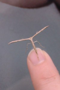 I believe it is a plume moth (with its wings closed)