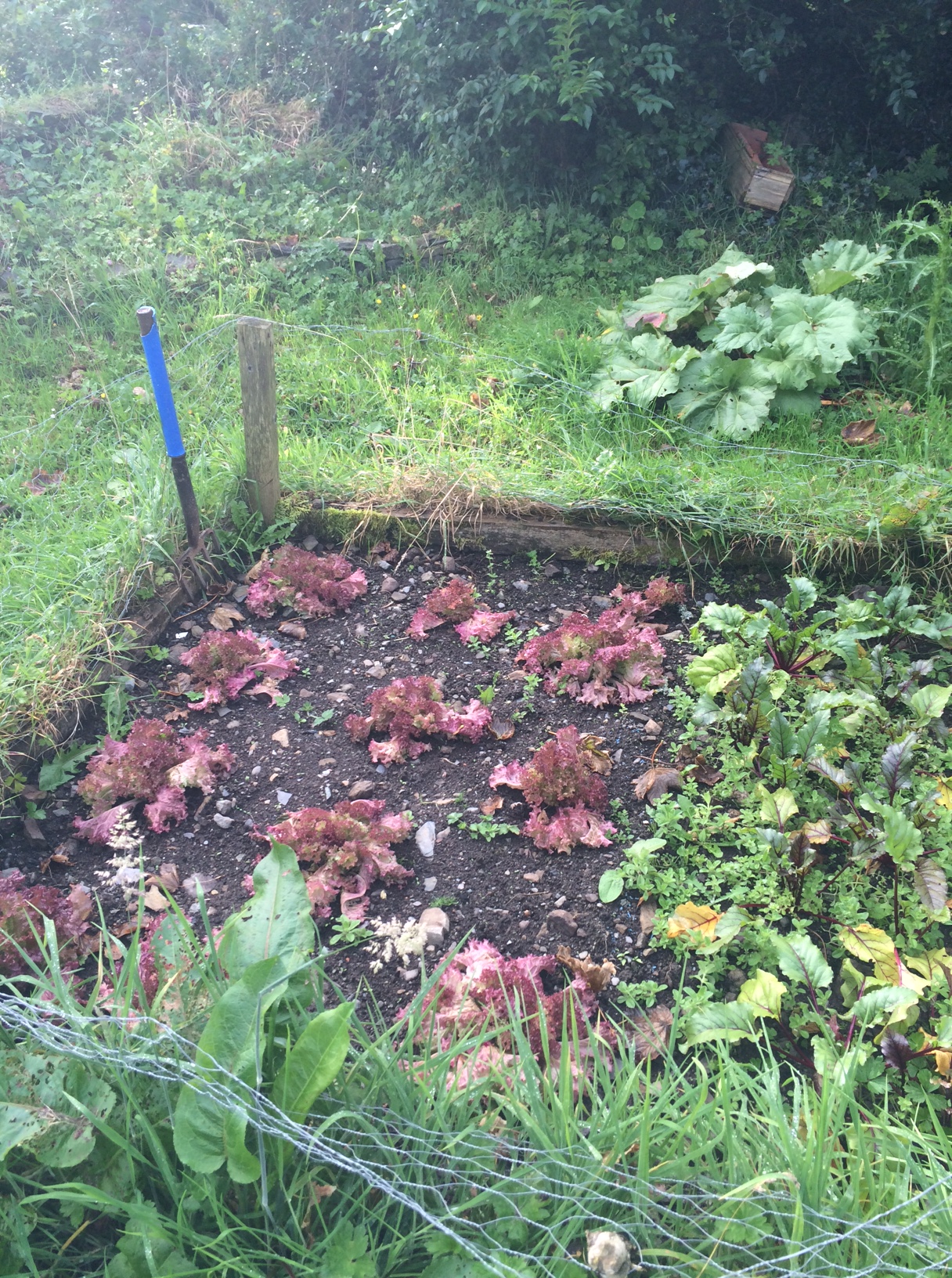 Outdoor lettuce looking healthy enough, along with rhubarb (& weeds!)